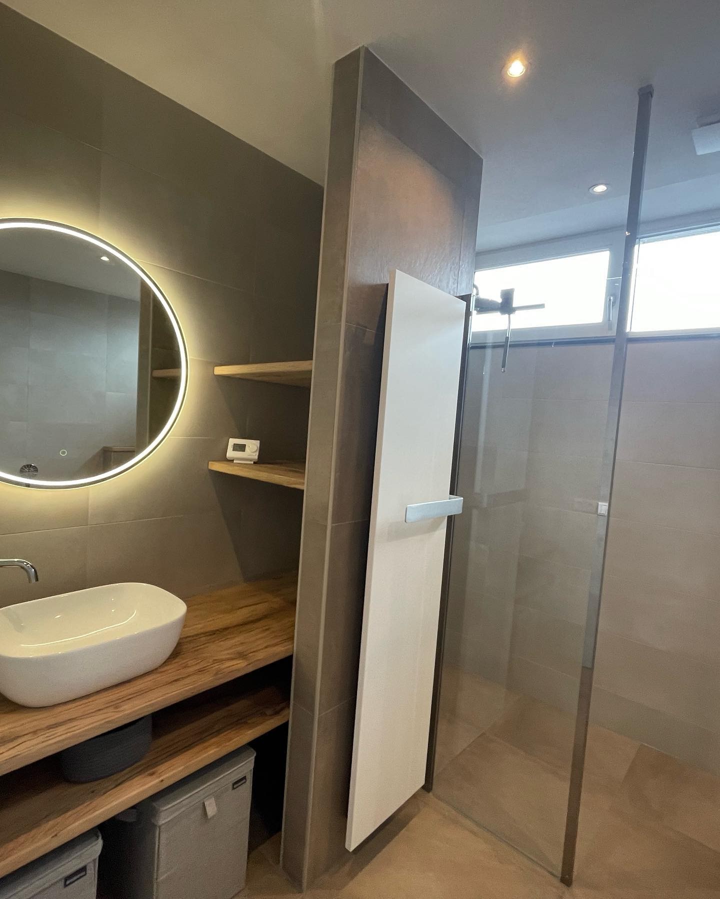 Om de donkere hoekje op te lichten, is er een spiegel geïnstalleerd met verlichting. Hierdoor kan de spiegel en het badmeubel op elk moment worden gebruikt, zonder dat de spotjes boven het badmeubel aan hoeven te staan.