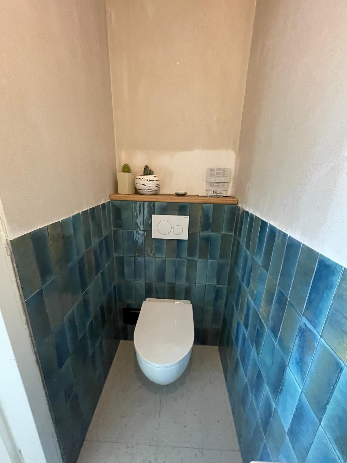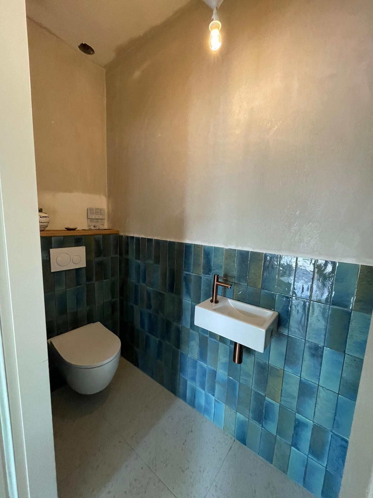 Het nieuwbouw project toilet in Eindhoven is klaar. De eigenaren hebben gekozen voor diepzee kleur wandtegels. Dit maakt de ruimte kleurrijk. De tegeltjes hebben 'vegen/overloop' als patroon. Doordat de patronen in elkaar overlopen, maakt dat de ruimte voor je gevoel een stuk groter.