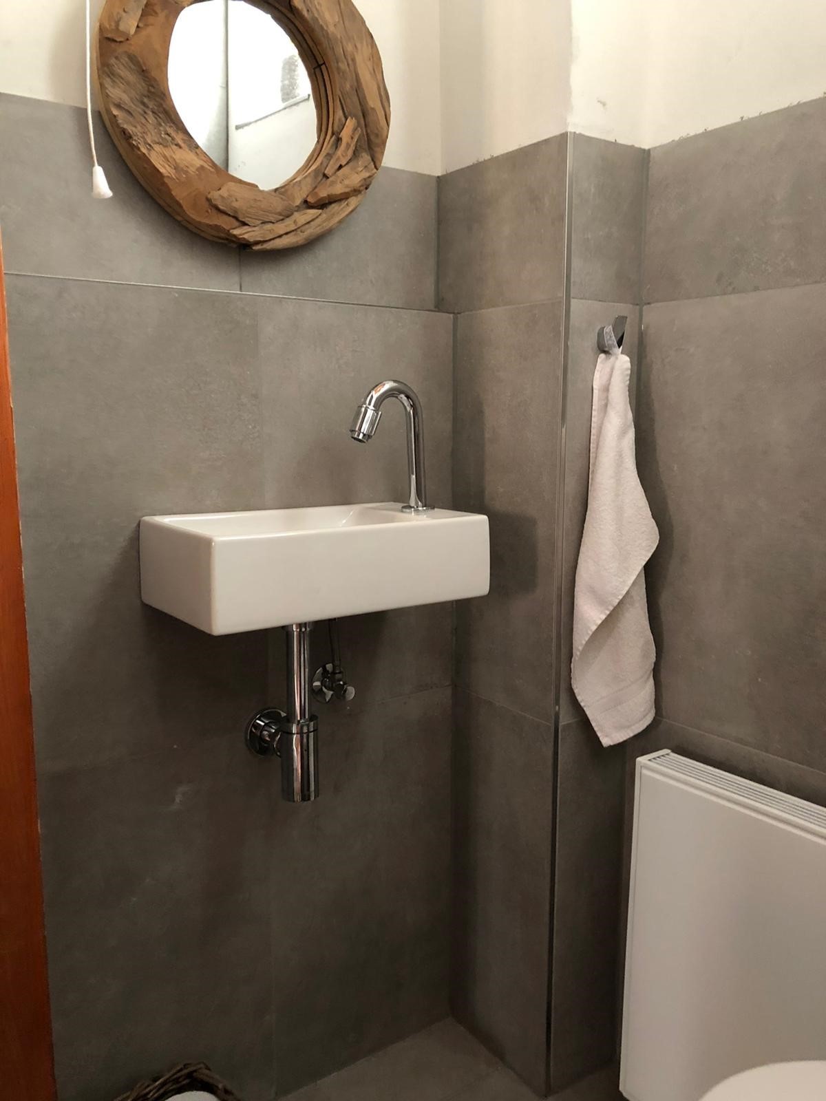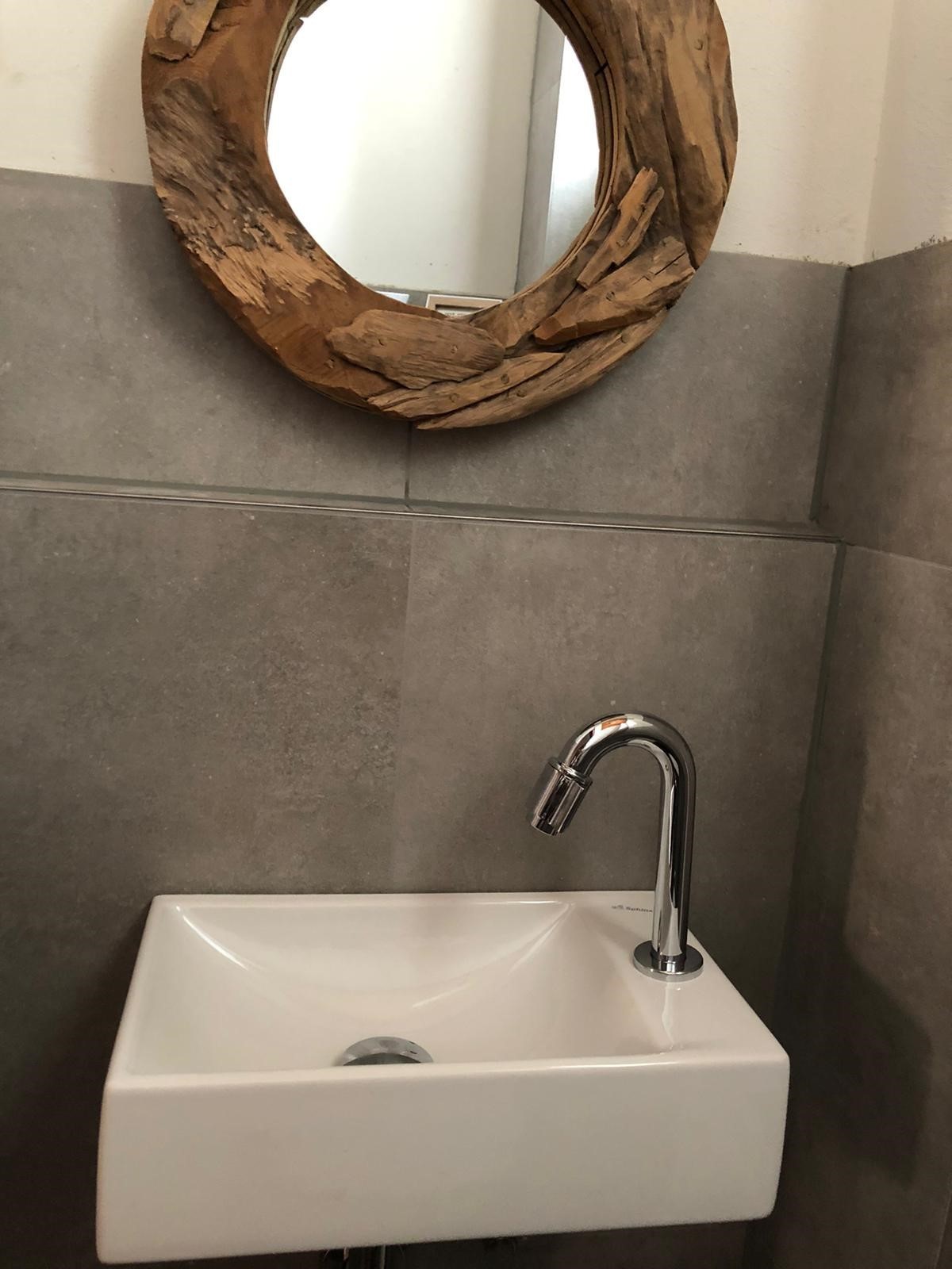 Na het verwijderen van het bestaande sanitair, zijn we eerst begonnen met het plaatsen van het Geberit kombifix inbouwreservoir. Voordeel van dit inbouwreservoir is dat deze zelfdragend is en in hoogte te verstellen is. Verder zijn de aansluitingen universeel waardoor ieder merk sanitair toiletpot erop gemonteerd kan worden. Het fontein werd vervangen voor het Sphinx 420 fontein. Door de rechthoekige vorm heb je een grote bak om je handen te wassen, echter slechts 23 cm diep. Daarboven een mooie ronde teakspiegel van 30 cm, welke mooi contrast geeft op de tegel en achterwand. De chromen accessoires van Geesa Wynck maken het geheel mooi af.